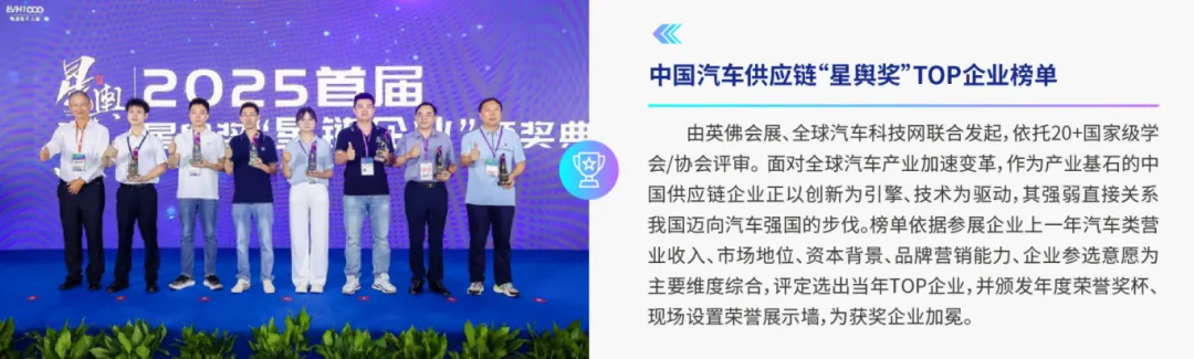 展会期间,由英佛会展、全球汽车科技网联合发起协同20余个国家级行业学会与协会,组建权威评审团,基于创新性、市场表现与行业贡献等多维度指标,现场评定并颁发年度TOP供应商等重磅荣誉奖项。获奖企业不仅将荣膺权威认证的荣誉奖杯,更将在现场专属的“荣誉展示墙”获得重点展示,接受数万专业观众的瞩礼,获得品牌价值的巅峰认证。