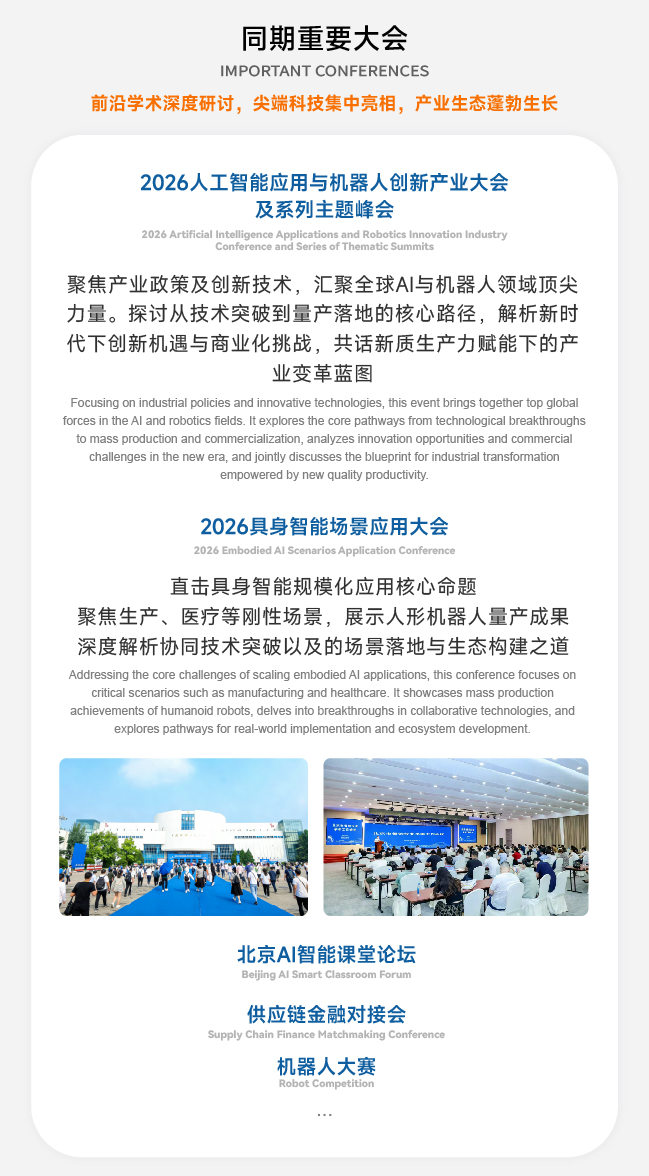 北京国际人工智能应用与机器人创新博览会(AI Show 2026)由北京人工智能学会、北京物联网智能技术应用协会、北京恒辉国际展览有限公司共同主办,北京电子商会协办。以“京聚全球智,AI创未来”为主题,30000㎡超大展区汇集全球450家知名品牌,5w+人次专业观众前来参观交流。展品涵盖人工智能基础层、人工智能技术层、人工智能应用层、智能全域机器人、AIoT(智能物联网)、机器人核心零部件、智慧传感器与终端、低空经济、AI教育及设备、消费电子等。博览会立足北京科创禀赋,聚焦全球前沿AI技术与落地应用,搭建“产学研用”协同创新平台,加速技术、人才与场景的深度融合,为北京建设全球人工智能创新高地注入强劲动力。