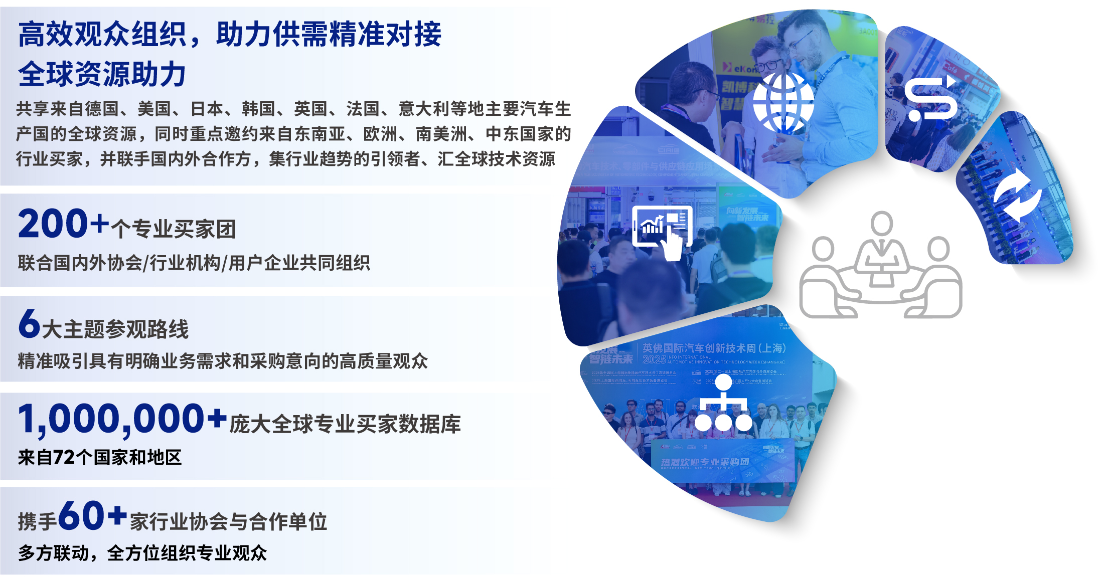 我们深刻理解“时间就是订单”。展会依托百万级全球精准买家数据库,重磅打造“VIP买家洽谈区”,同步启动“全球链接计划”,重点邀约东南亚、中亚、欧洲等“一带一路”沿线国家采购团,会前精准匹配,会中设立专属洽谈区,为您直接链接上汽、蔚来、宁德时代等主机厂与Tier 1企业的核心采购决策者。往届展会促成合作成功率高达85%,这里就是您的年度业绩“加速器”。