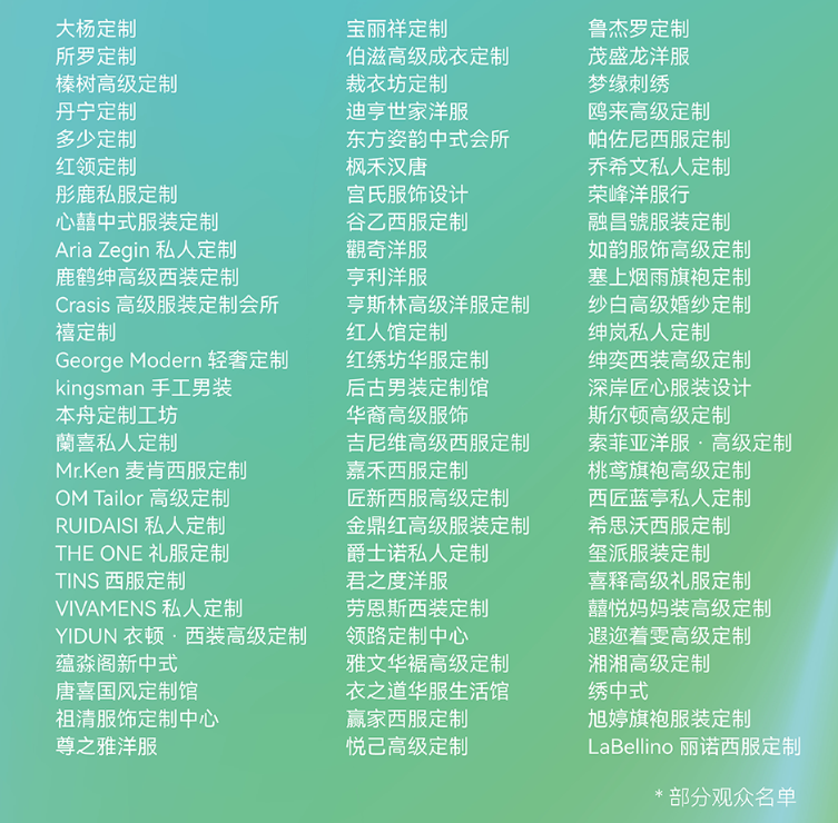 服装定制培训机构、中高端服饰经营机构、中高端美业培训机构、服装院校、服装商协会、非遗文化民间组织、影视圈经纪公司等