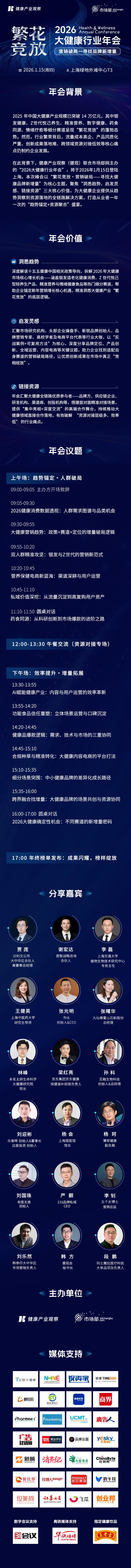 2026 年中国大健康产业规模将突破 16 万亿元,银发康养、精准营养、数字健康、药食同源、情绪疗愈等细分赛道呈现 “繁花竞放” 的蓬勃态势。然而,产品同质化严重、创新落地受阻、资源协同不足等行业痛点,仍制约着品牌与消费者需求的精准匹配。在此背景下,以 “繁花竞放・营销破局 —— 寻找大健康品牌新增量” 为主题的 2026 大健康行业年会,将于 2026 年 1 月 15 日在上海盛大启幕。本次盛会由健康产业观察联合市场部网主办,同步推出 “健观奖” 评选颁奖与 “健观展” 资源对接专区,聚焦 “洞悉趋势、启发灵感、链接资源” 三大核心价值,为全产业链打造集趋势研判、案例标杆、资源聚合于一体的年度盛宴,助力品牌破解增长困局。
