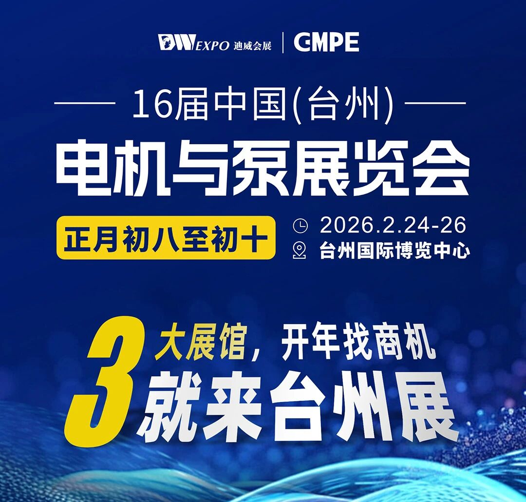 第16届中国(台州)电机与泵展览会将于2026年2月24-26日在台州国际博览中心隆重举行。