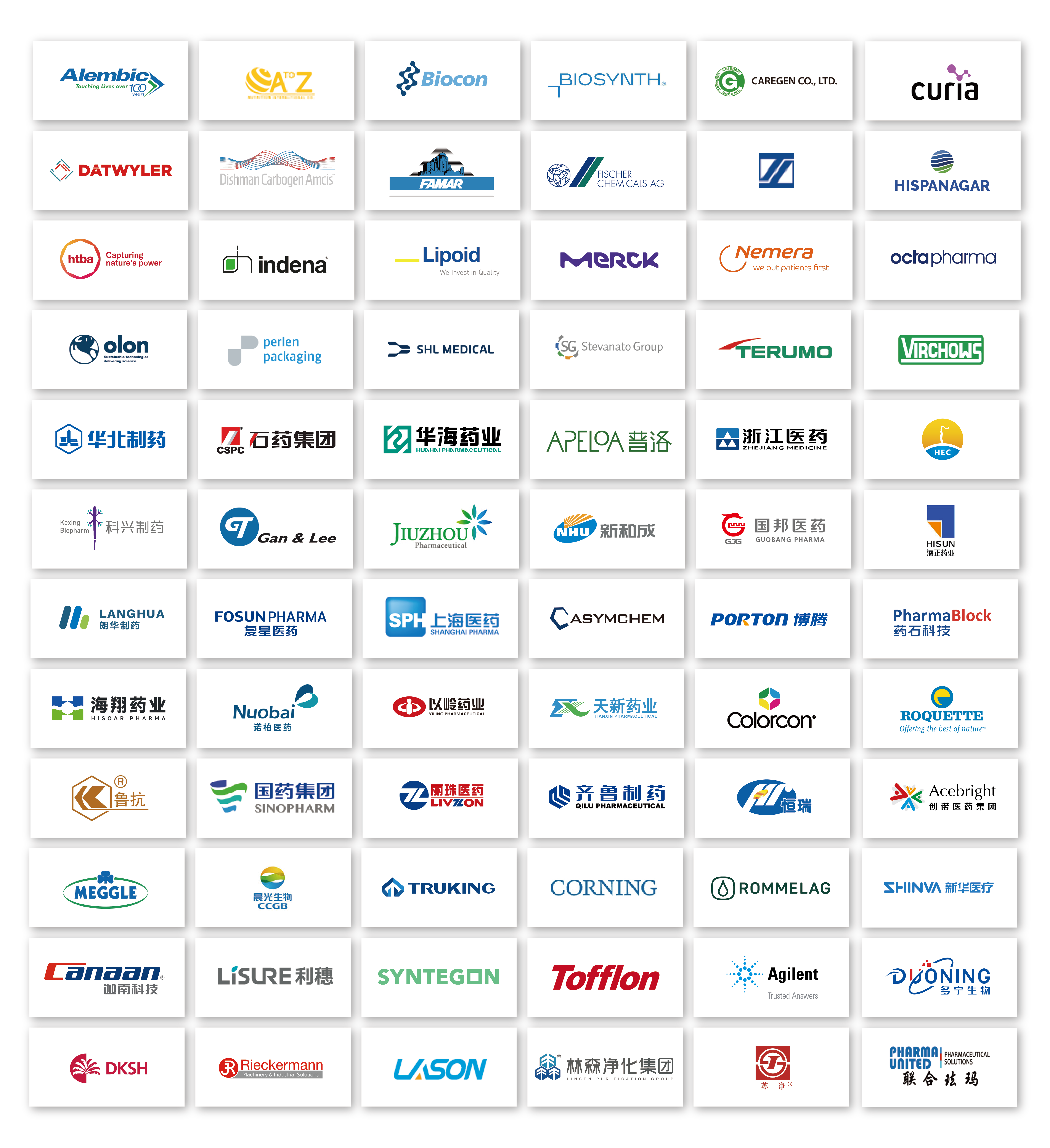 - 汇聚Octapharma AG, BIOSYNTH, Biocon, HISPANAGAR, CURIA Global Inc., FAMAR, OLON SPA, Dishman Carbogen Amcis, ALEMBIC, AtoZ, Lipoid GmbH, HTBA, LINNEA SA, Indena S.p.A., Datwyler Pharma Packaging, H&T Presspart, Nemera, Perlen Packaging, SHL Medical, Stevanato Group S.p.A, TERUMO Europe NV, Fischer Chemicals AG, Dr. Reddy's, EUROAPI, CAREGEN, Merck等家国际翘楚以及华海药业、九洲药业、海正药业、创诺医药、齐鲁制药、石药控股、华北制药、以岭万洲、罗欣、亚什兰、罗盖特、凯莱英、甘李药业、晨光生物、禹王制药、东富龙、楚天科技、新华医疗、迦南科技、多宁生物、汉邦科技、SCHOTT、威高普瑞、森松、联合珐玛等国内行业龙头。