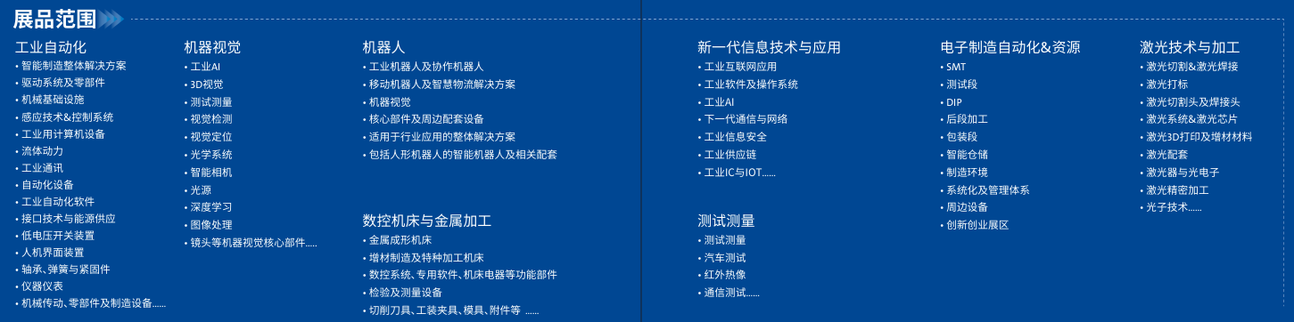 本届展会深度整合工业生态核心板块,重磅推出:工业自动化展、机器视觉展、激光技术展、数控机床与金属加工展、机器人展、新一代信息技术与应用展、工业互联网展、测试测量展、CMM电子制造自动化&资源展在内的八大主题展区,以"纵向深化、横向贯通、立体呈现"三大维度重构工业展会新范式:纵向聚焦各细分领域最前沿技术突破,横向构建跨领域协同创新的产业生态,立体化呈现从单点技术到系统解决方案的全维度创新图谱,以专业深度赋能产业升级,以创新广度驱动智造未来,打造工业技术发展的风向标。